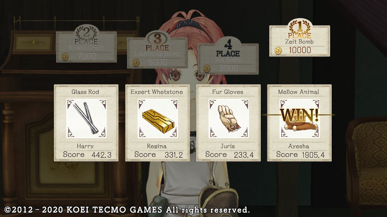 There's a few other details of the basic gameplay that feel significant. Firstly, item registration in this game is very generous compared to previous games - to the point that slot management isn't really important at all anymore. Most shops allow you to register related items, and as they level up, you are given up to a maximum of 25 registration slots (per shop!) that you can fill as you wish, refilled roughly monthly (or maybe every ~10-15 days?). Furthermore, Vierzeburg holds a Bazaar for the middle 10 days of each month, offering up to ~5 more shops that you can register to. Especially with the postgame Metastasis Wing, you essentially have probably ~200 registerable shop slots that you can access at any given time! Speaking of which, outside of the Bazaar, the only other really missable events are the Treasure Contests, which are held twice a year and basically act as a high-value item delivery check. Given that each contest has a 2-month submission window (and the requirements to get 1st every time are quite easy), this isn't a concern at all. You even get a little teddy bear item partway through the game that grants you the wins for the last ~4 contests for free.