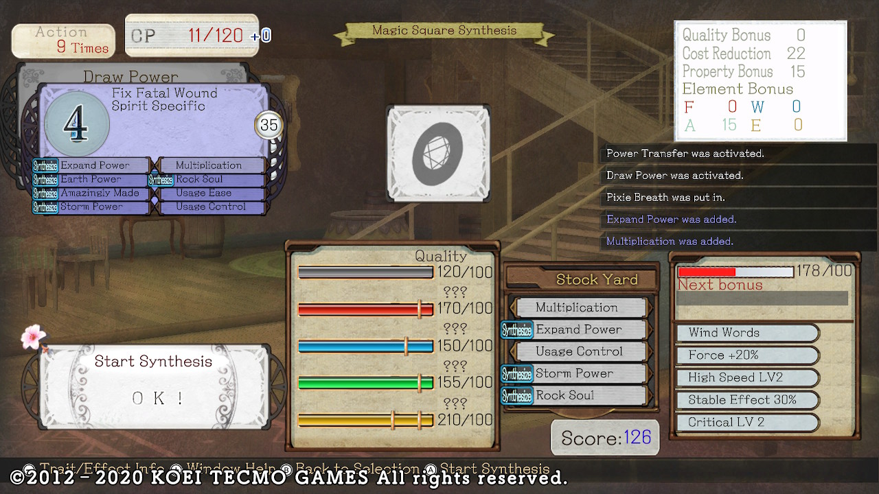 The synthesis is by far the most significantly changed aspect of the game; the system is a complete departure from the Arland games. Gathered materials no longer have individual, randomized traits and quality - rather, those are all inherent qualities of the item type which makes syntheses very consistent. Also as a result, items added to synthesis are not chosen by individual instance; if you do a 2-unit synthesis, you cannot choose 2 different ingredients per slot (ex. 2 Polish Powders with different traits) but must have multiple exact copies of each item. The actual synthesis process is also a strangely-complex system balancing various levels indicating quality & 4 different element values to upgrade the final items' effects, alongside synthesis traits that boost these values and skills that can grant benefits towards unlocking an item's inherent properties, boost levels, duplicate ingredient effects, or transfer/delete properties from the final item. It's as convoluted to learn in practice as it sounds in a brief description, but I eventually found quite a bit of fun in it. But one thing I really don't like about the system is that it doeesn't allow you to re-order or select final properties from a list as you could in Arland, but instead locks everything into a very specific order in the final item, making juggling effects for ultimate item crafting extremely unfun. I should emphasize that this only applies to extremely optimized items (ie. for superbosses, which is why I didn't want to do them); making good late/endgame items isn't easy, but isn't that tedious either - some good Stat+ effects, Skill bonuses, and a few elemental power bonuses will get you very far very quickly with no sweat. There's a number of other intricacies and little irritations that I have with the system, but overall it was at least a very fun change of pace. I'm not sure if I'll miss the system too much in E&L though - they decided to redo the system after Ayesha, probably because people didn't like it much in general.